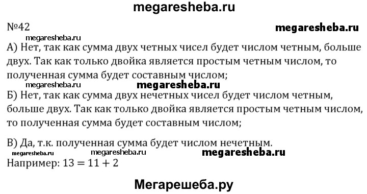 42. Можно ли простое число записать в виде суммы: а) двух чётных чисел; б) двух нечётных чисел; в) чётного и нечётного чисел?