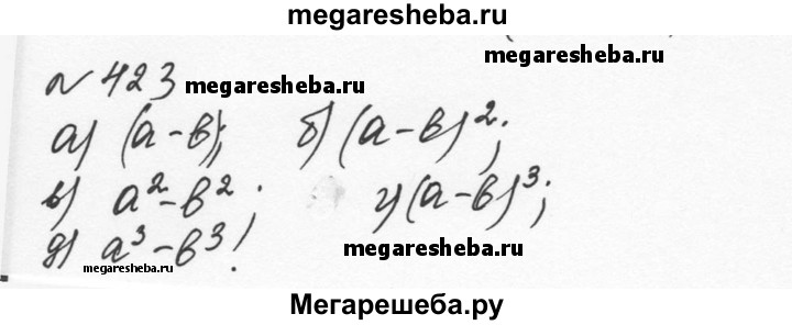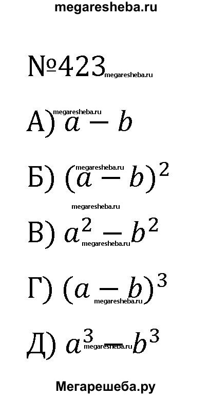 423. Запишите: а) разность а и b; б) квадрат разности а и b; в) разность квадратов а и b; г) куб разности а и b; д) разность кубов а и b.