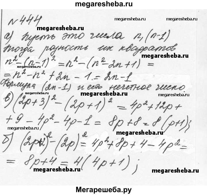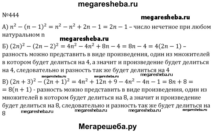 444.Докажите, что: а) разность квадратов двух последовательных натуральных чисел является нечётным числом; б) разность квадратов двух последовательных чётных чисел делится на 4; в) разность квадратов двух последовательных нечётных чисел делится на 8.
