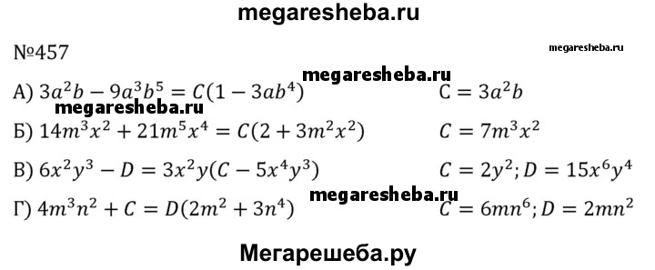 457. Вместо букв С и D подберите одночлены так, чтобы выполнялось равенство: а) 3а2b - 9а3b5 = С(1 - 3аb4); б) 14m3x2 + 21m5x4 = С(2 + 3 m2х2); в) 6х2у3 - D = Зх2у(С - 5х4у3); г) 4m3n2 + С = D(2m2 + Зn4).