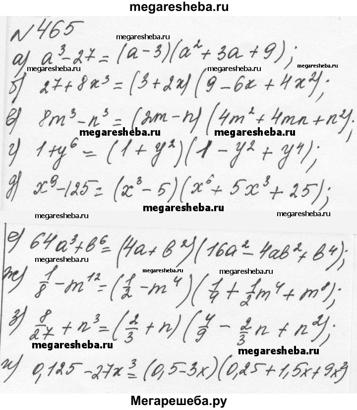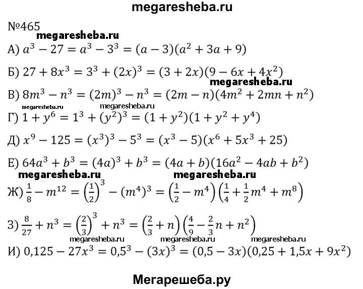 465 а) a3-27; б) 27+8x3; в) 8m3-n3; г) 1+y6; д) x9-125; е) 64a3+b6; ж) 1/8-m12; з) 8/27+n3; и) 0,125-27x3.