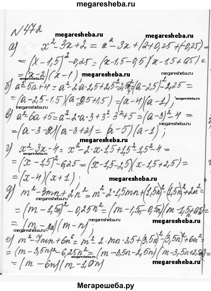 472. Разложите многочлен на множители, предварительно представив один из его членов в виде суммы: а) x2-3x+2; б) a2-5a+4; в) a2-6a+5; г) x2-3x-4; д) m2-3mn+2n2; е) m2-7mn+6n2.