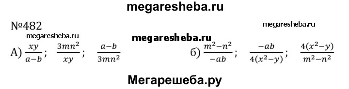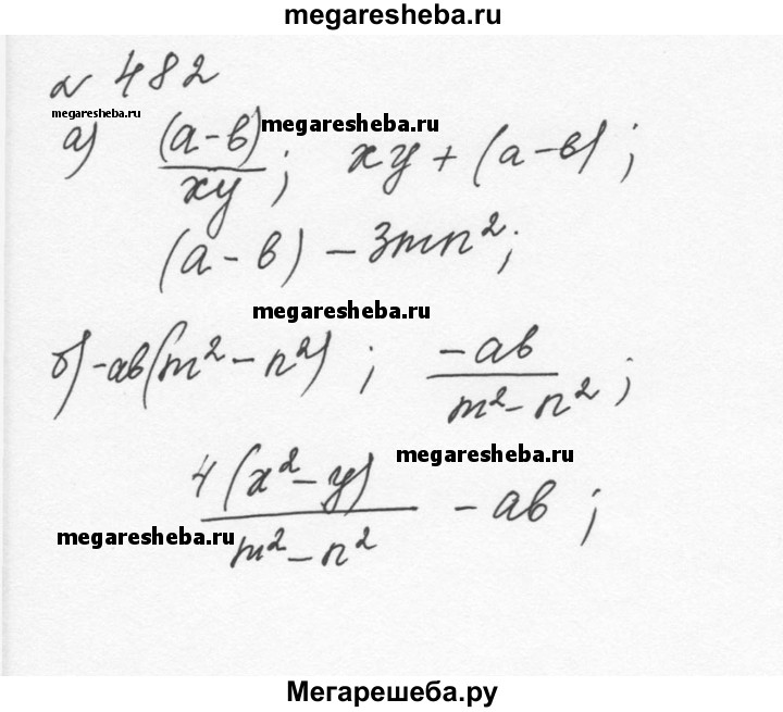 482. Запишите три алгебраические дроби, используя данные выражения: а) ху, (а - b), 3mn^2; б) m^2 – n^2, -ab, 4(х^2 - у).