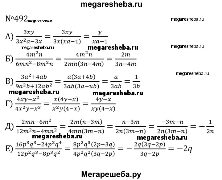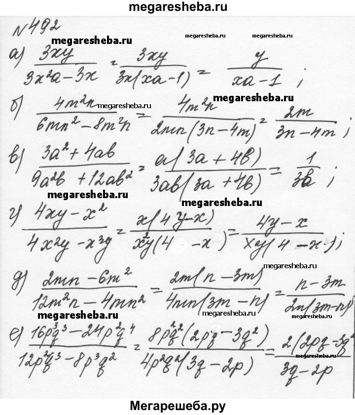 492 а) 3xy/(3x2a-3x); б) 4m2n/(6mn2-8m2n); в) (3a2+4ab)/(9a2b+12ab)2; г) (4xy-x2)/(4x2y-x3y); д) (2mn-6m2)/(12m2n-4mn2; е) (16p3q3-24p2q4)/(12p2q3-8p3q2).