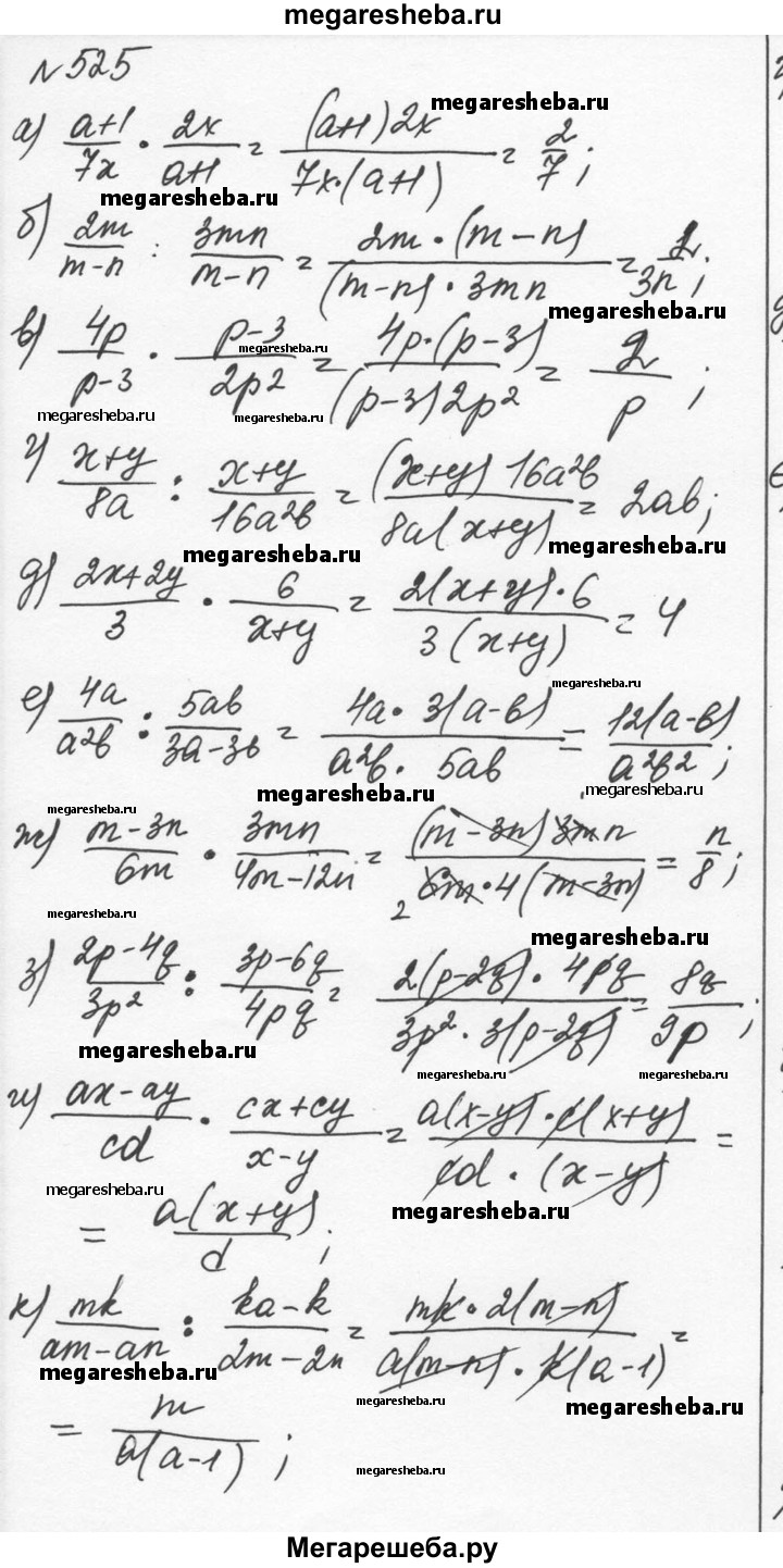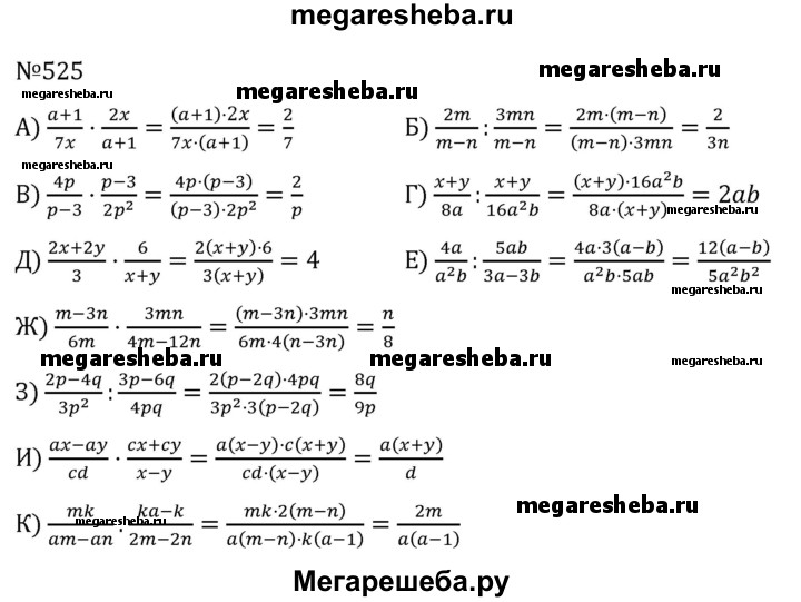 525 а) (a+1)/7x *2x/(a+1); б) 2m/(m-n):3mn/(m-n); в) 4p/(p-3) * (p-3)/2p3; г) (x+y)/8a:(x+y)/16a2b; д) (2x+2y)/3*6/(x+y); е) 4a/a2b:5ab/(3a-3b); ж) (m-3m)/6m * 3mn/(4m-12n); з) (2p-4q)/3p2 : (3p-6q)/4pq; и) (ax-ay)/cd * (cx+cy)/(x-y); к) mk/(am-an):(ka-k)/(2m-2n).