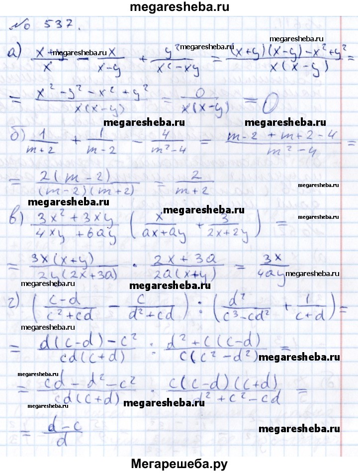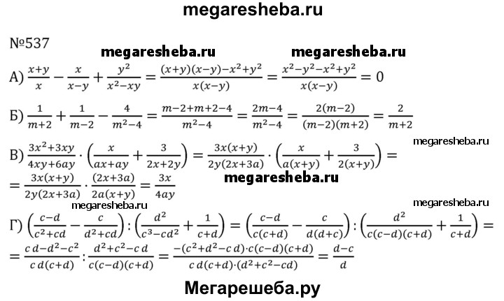 537 а) (x+y)/x-x/(x-y)+y2/(x2-xy); б) 1/(m+2)+1/(m-2)-4/(m2-4); в) (3x2+3xy)/(4xy+6ay)*(x/(ax+ay)+3/(2x+2y)); г) ((c-d)/(c2+cd) - c/(s2+cd)):(d2/(c3-cd2)+1/(c+d)).