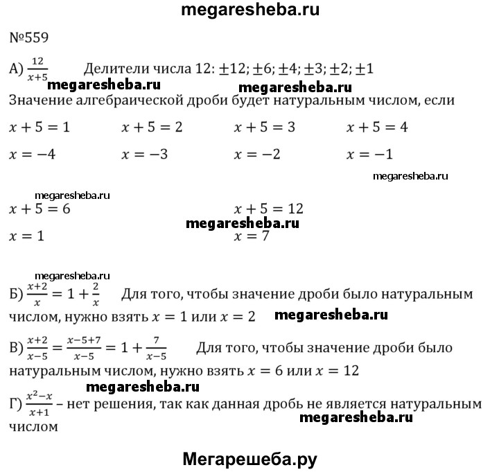 559. Найдите, если это возможно, числовые значения х, для которых значение алгебраической дроби — натуральное число: А) 12/ x + 5; б) x + 2 / x; в) x + 2 / x – 5; г) x^2 – x / x + 1.