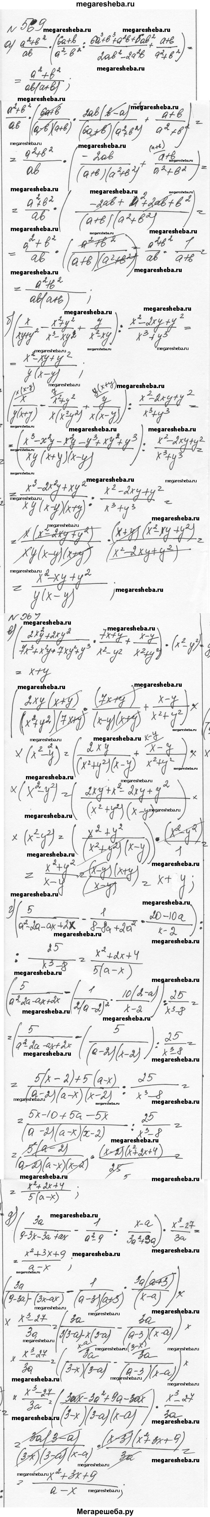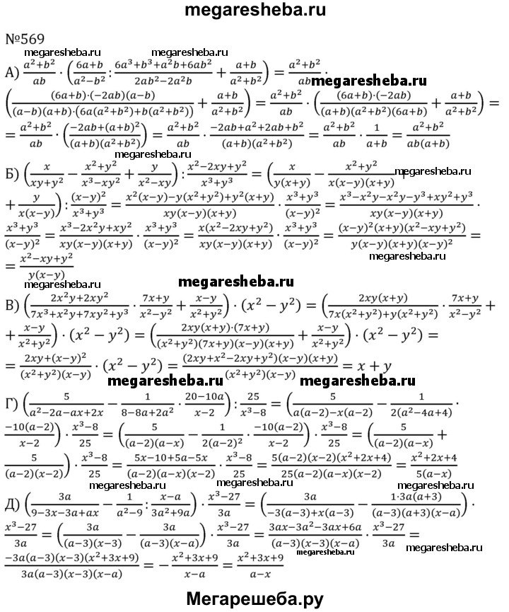 569 а) (a2+b2)/ab*((6a+b)/(a2-b2):(6a3+b3+a2b+6ab2)/(2ab2-2a2b) + (a+b)/(a2+b2))=(a2+b2)/ab(a+b); б) (x/(xy+y2) - (x2+y2)/(x3-xy2) + y/(x2-xy)) : (x2-2xy+y2)/(x3+y3) = (x2-xy+y2)/y)x-y); в) ((2x2y+2xy2)/(7x3+x2y+7xy2+y3) * (7x+y)/(x2-y2) + (x-y)/(x2+y2))*(x2-y2) = x+y; г) (5/(a2-2a-ax+2x)- 1/(8-8a+2a2) * (20-10a)/(x-2)):25/(x3-8) = (x2+2x+4)/5(a-x); д) (3a/(9-3x-3a+ax) - 1/(a2-9) : (x-a)/(3a2+9a))* (x2-27)/3a - (x2-3x+9)/(a-x).