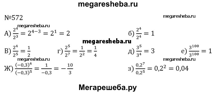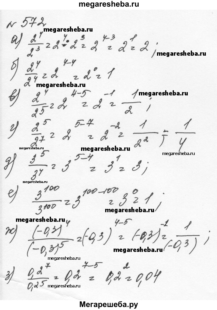 572 а) 2^4/2^3; б) 2^4/2^4; в) 2^4/2^5; г 2^5/2^7; д) 3^5/3^4; е) 3^100/3^100; ж) (-0,3)4/(-0,3)5; з) 0,2^7/0,2^5.