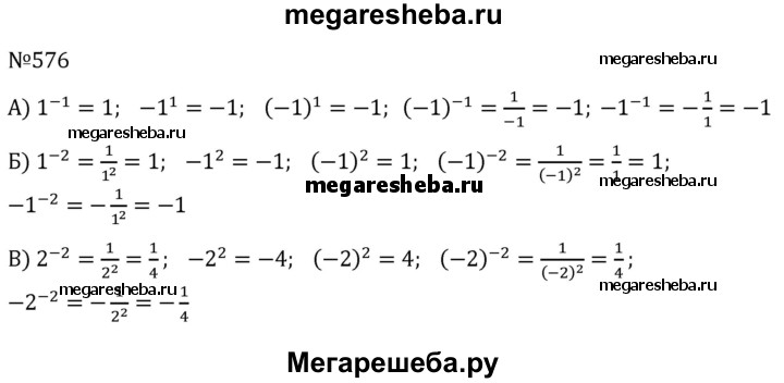 576 а) 1^-1; -1^1; (-1)1; (-1)^-1; -1^-1; б) 1^-2;-1^2;(-1)2;(-1)^-2;-1^-2; в) 2^-2; -2^2; (-2)2; (-2)^-2; -2^-2.