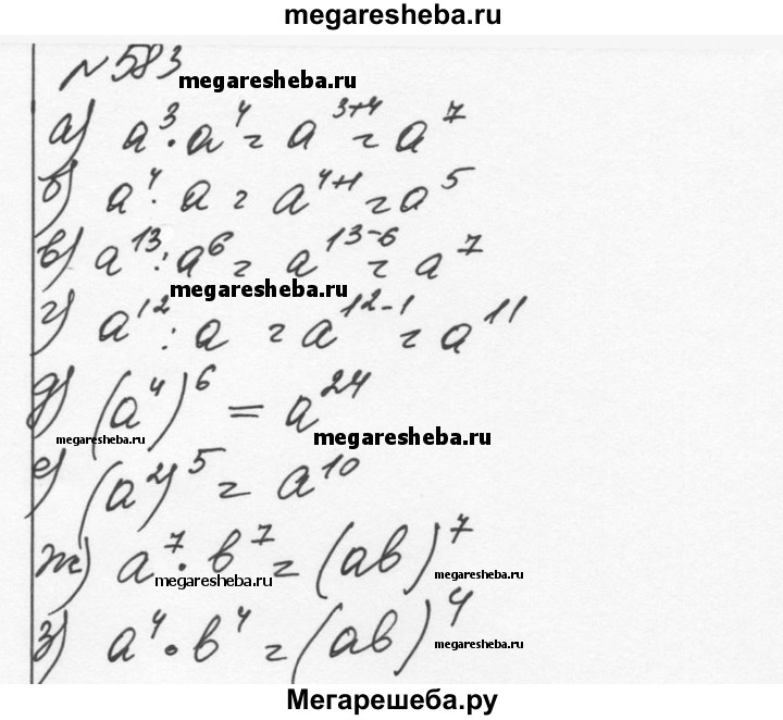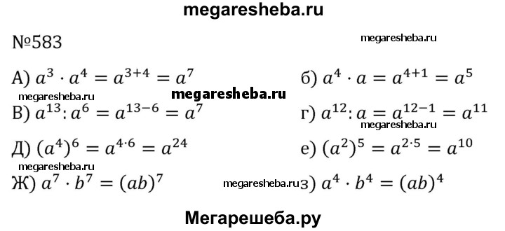 Запишите в виде степени с целым показателем, если а a =/ 0 (583—584): а) а3 * а4; б) а4 * а; в) a13 : а6; г) а12 : а; Д) (а4)6; е) (а2)5; ж) а7 * b7; з) а4 * b4.