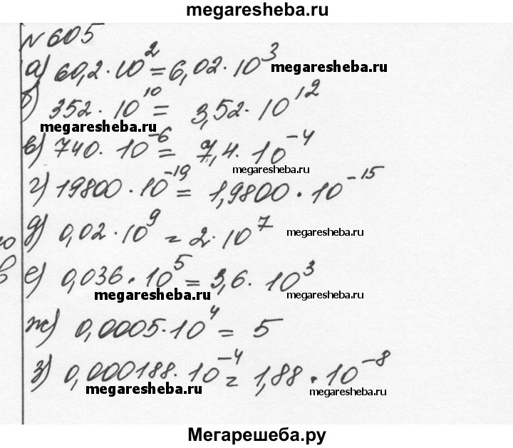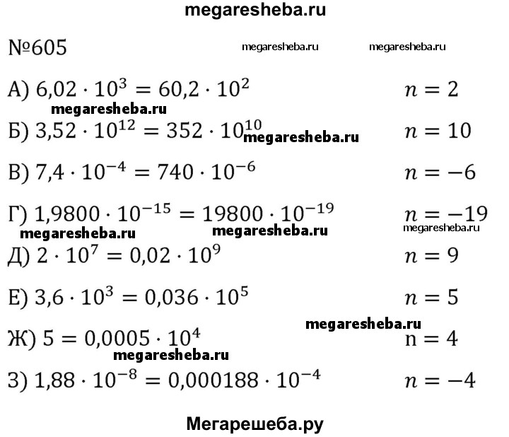 605 При каком значении n выполняется равенство: а) 60,2 * 10n = 6,02 * 10^3; б) 352 * 10n = 3,52 * 10^12; в) 740 * 10n = 7,4 * 10^-4; г) 19 800 * 10n = 1,9800 * 10^-15; д) 0,02 * 10n = 2 * 10^7; е) 0,036 * 10n = 3,6 * 10^3; ж) 0,0005 * 10n = 5; з) 0,000188 * 10n = 1,88 * 10^-8?
