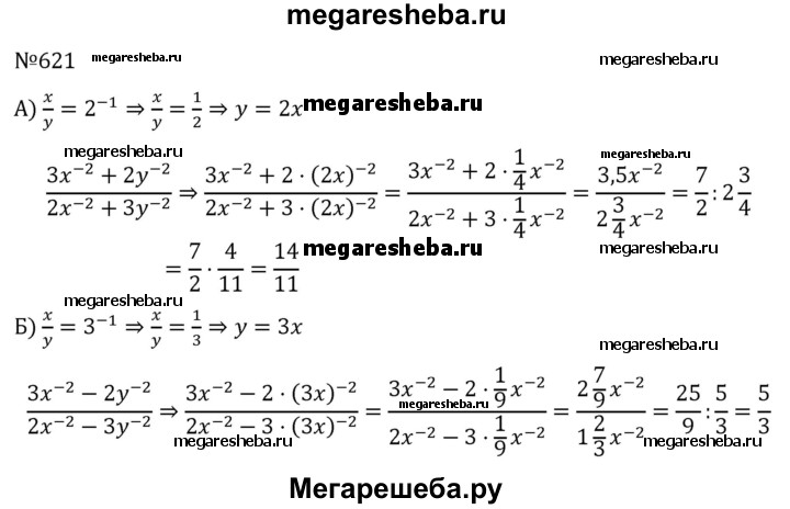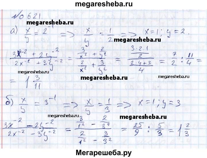621 Найдите значение выражения: а) (3x^-2 + 2y^-2)/(2x^-2+3y^-2), если x/y=2^-1; б) (3x^-2 - 2y^-2)/(2x^-2-3y^-2), если x/y=3^-1.