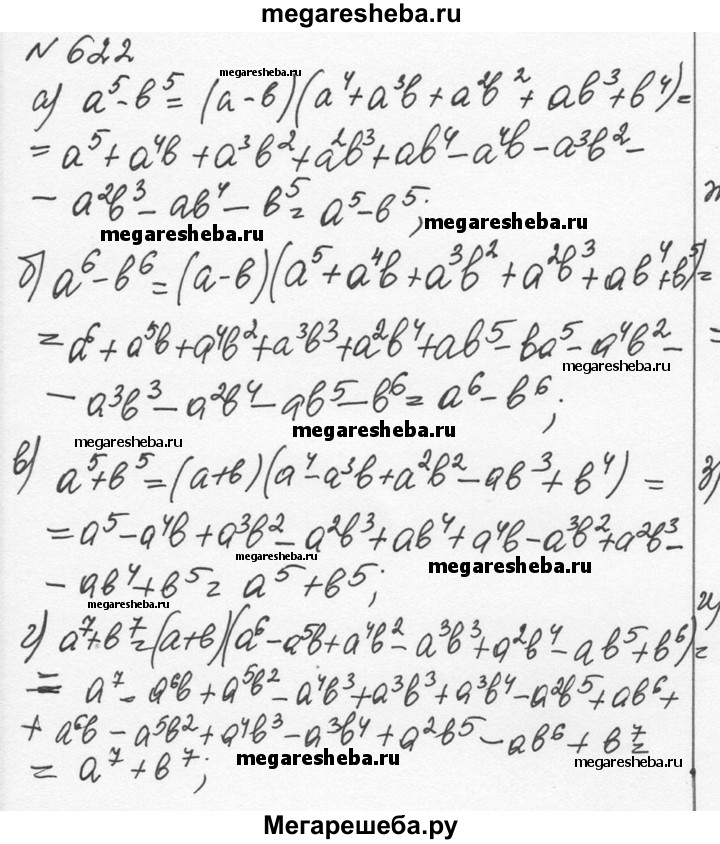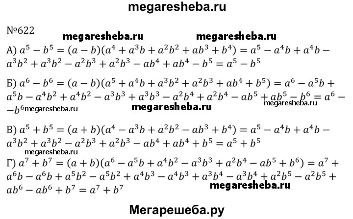 622. Доказываем. Докажите формулу разложения на множители для: А) a^5 – b^5; б) a^6 – b^6; в) a^5 + b^5; г) a^7 +^7.