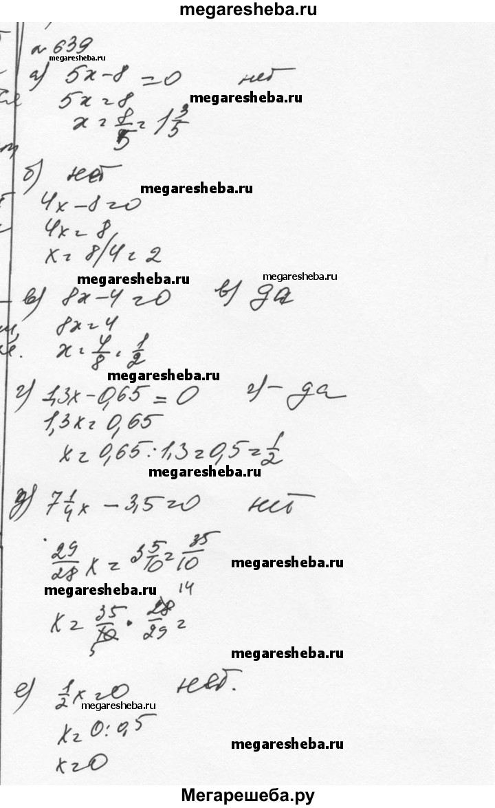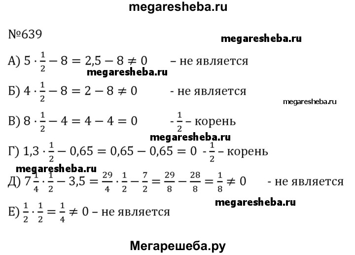 639. Является ли число1/2 корнем уравнения: а) 5х – 8 = 0; б) 4х – 8 = 0; в) 8х – 4 = 0; г) 1,3х – 0,65 = 0; д) 7 1/4х – 3,5 = 0; е)1/2х = 0?
