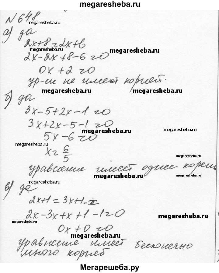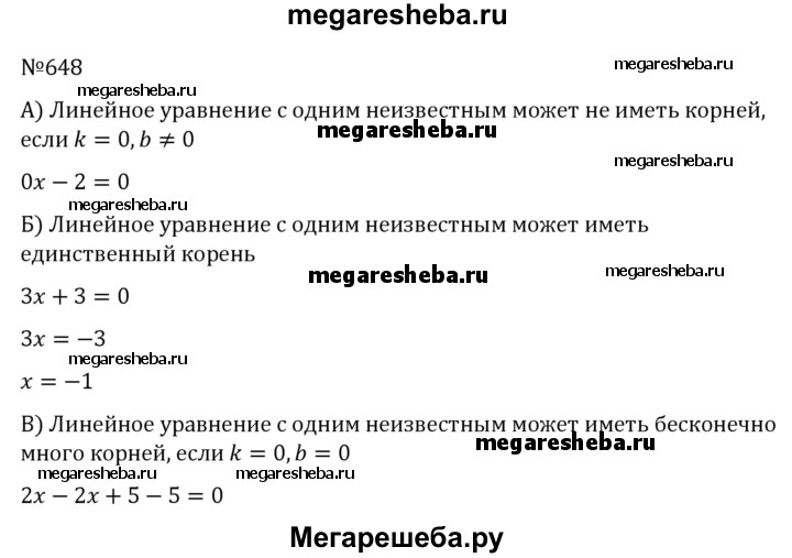 648. а) Может ли линейное уравнение с одним неизвестным не иметь корней? Приведите примеры. б) Может ли линейное уравнение с одним неизвестным иметь единственный корень? Приведите примеры. в) Может ли линейное уравнение с одним неизвестным иметь бесконечно много корней? Приведите примеры.