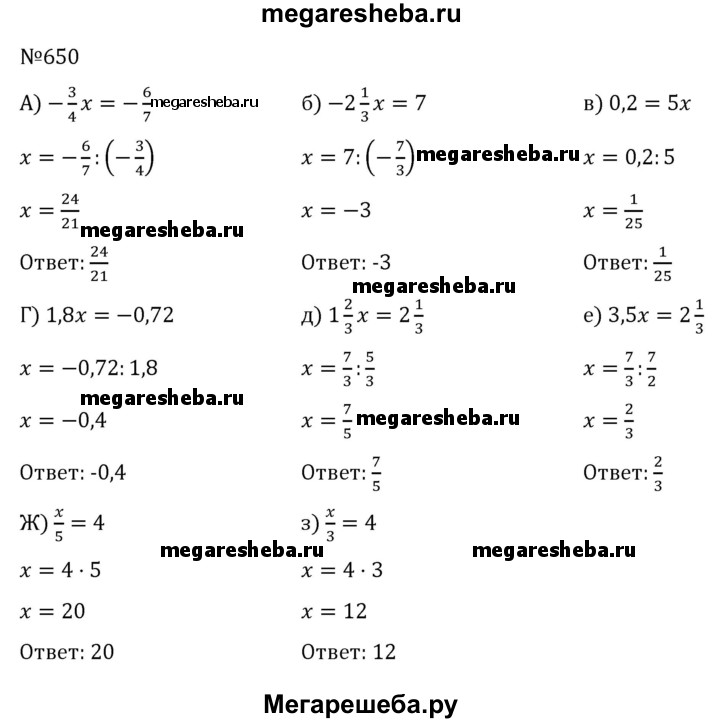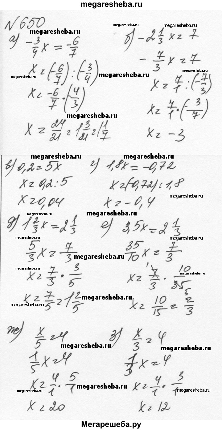650 а) -3/4*x=-6/7; б) -2*1/3*x=7; в) 0,2=5x; г) 1,8x=-0,72; д) 1*2/3*x=2*1/3; е) 3,5x=2*1/3; ж) x/5=4; з) x/3=4.