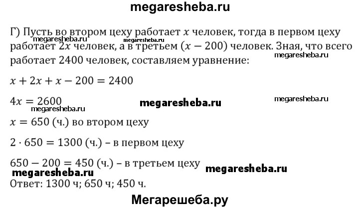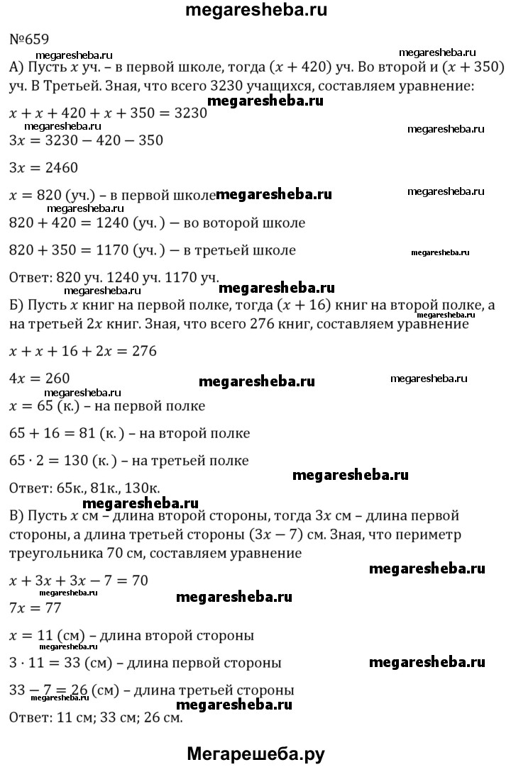 659. а) В трёх школах 3230 учащихся. Во второй школе на 420 учащихся больше, чем в первой. Сколько учащихся в каждой школе? б) На трёх полках 276 книг. Сколько книг на каждой полке, если на второй полке на 16 книг больше, чем на первой? в) Периметр треугольника равен 70 см. Определите стороны треугольника, если первая сторона в три раза больше второй и на 7см больше третьей стороны. г) В трёх цехах завода работают 2400 человек. В первом цехе вдвое больше рабочих, чем во втором, а в третьем – на 200 рабочих меньше, чем во втором. Сколько рабочих в каждом цехе?