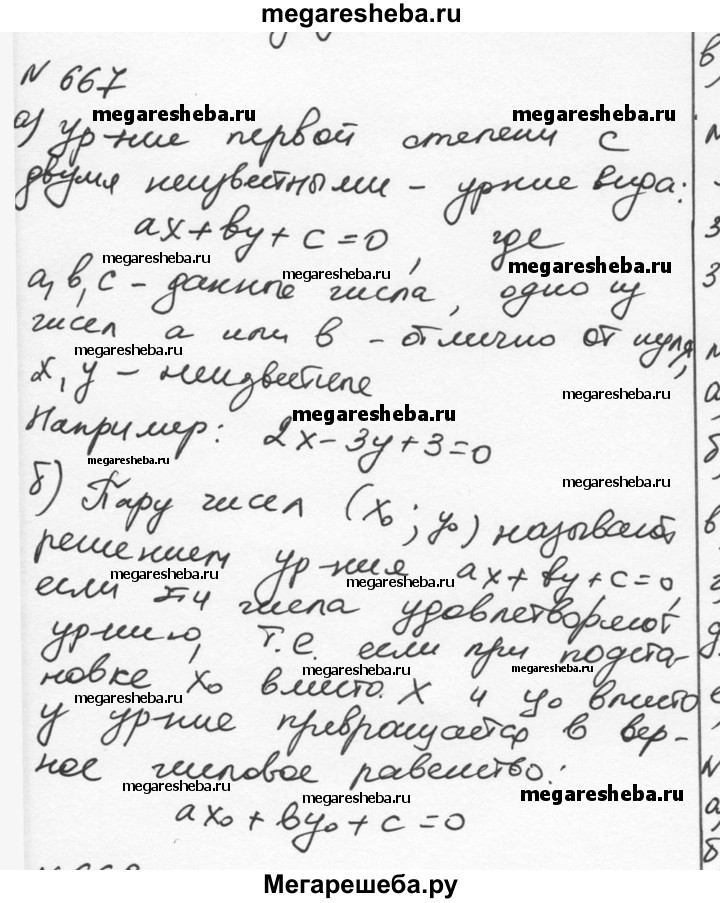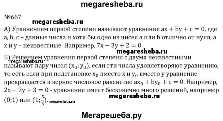 667. а) Какое уравнение называют уравнением первой степени с двумя неизвестными? Приведите примеры. б) Что называют решением уравнения первой степени с двумя неизвестными? Приведите примеры.