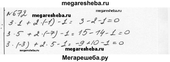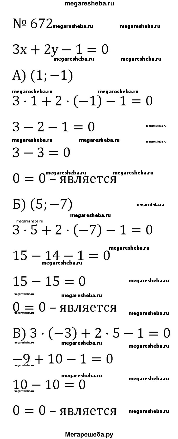672. Покажите, что пары чисел (1; -1), (5; -7), (-3; 5) являются решениями уравнения 3х + 2y – 1 = 0.