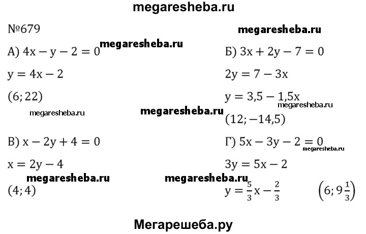 679. Запишите какое-либо решение уравнения: а) 4х – у – 2 = 0; б) 3х + 2у – 7 = 0; в) х – 2у + 4 = 0; г) 5х – 3у – 2 = 0.