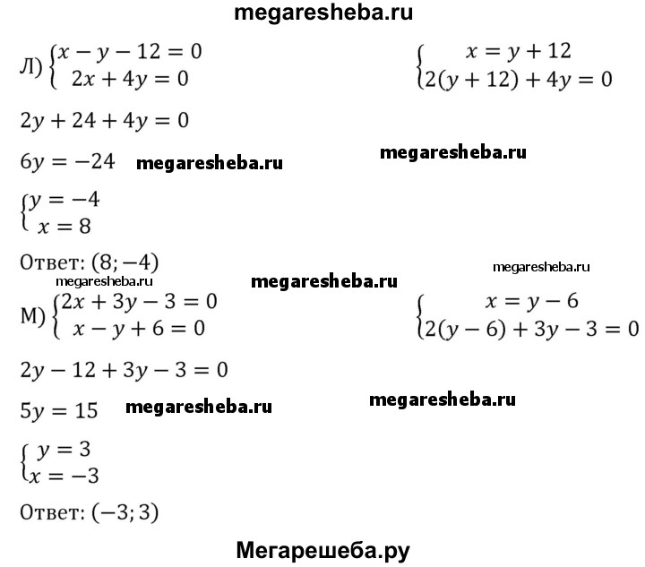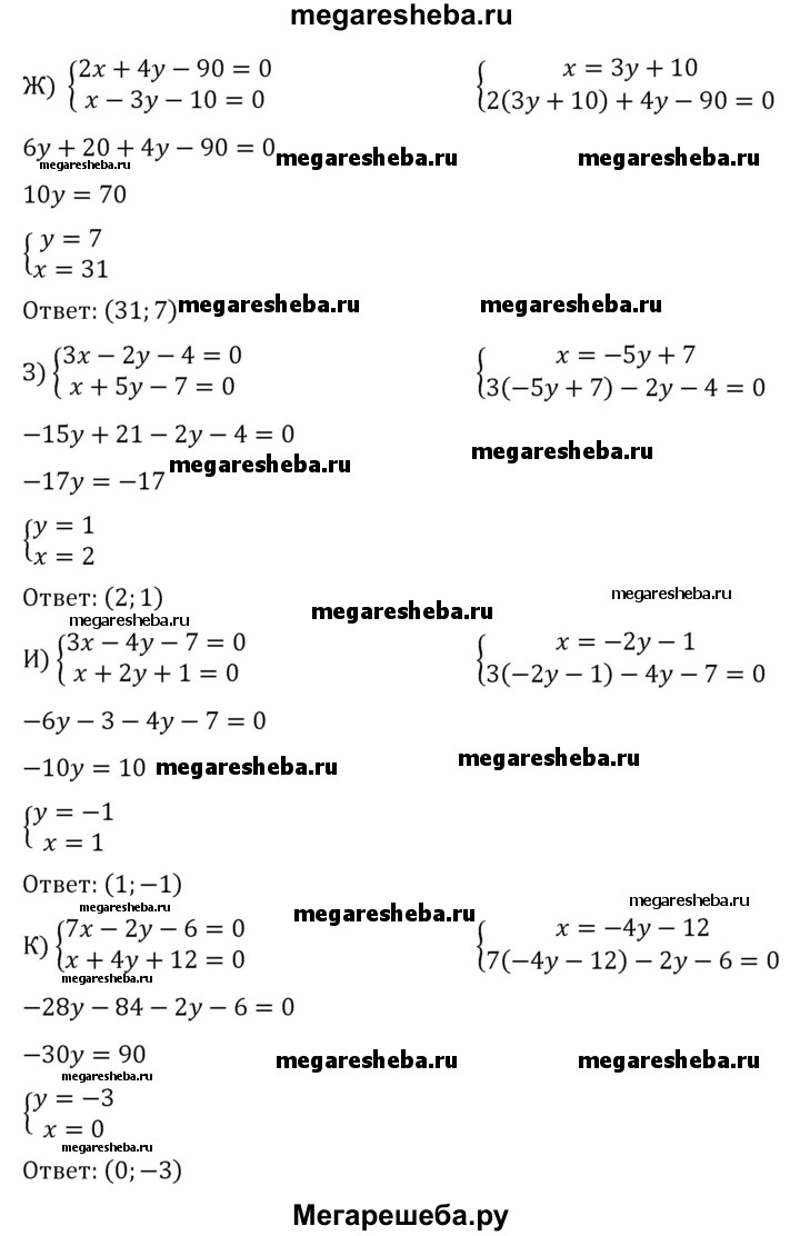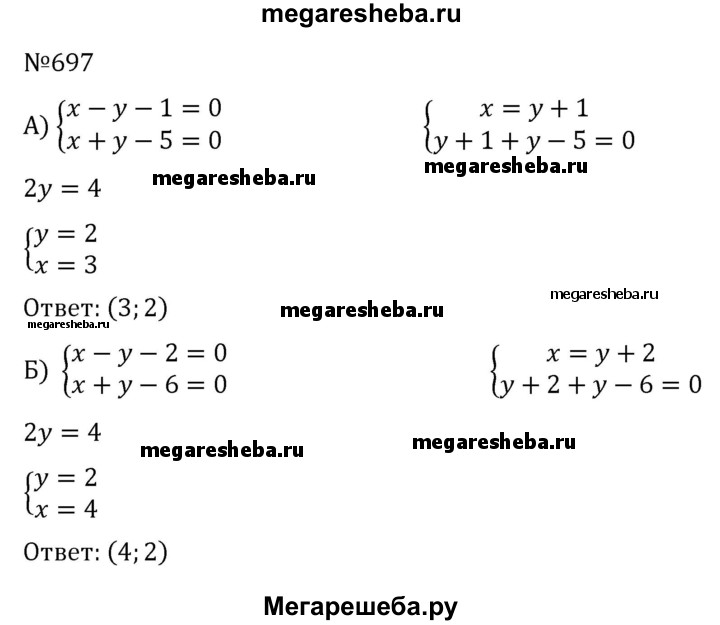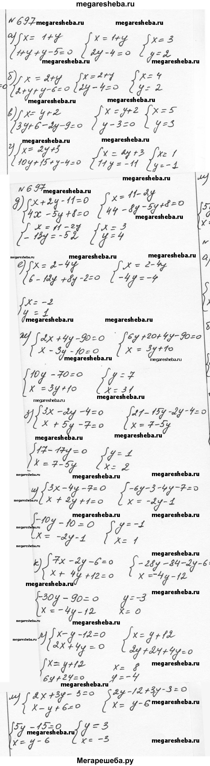 697 а) система x-y-1=0, x+y-5=0; б) система x-y-2=0, x+y-6=0; в) система x-y-2=0, 3x-2y-9=0; г) система x-2y-3=0, 5x+y-4=0; д) система x+2y-11=0, 4x-5y+8=0; е) система x+4y-2=0, 3x+8y-2=0; ж) система 2x+4y-90=0, x-3y-10=0; з) система 3x-2y-4=0, x+5y-7=0; и) система 3x-4y-7=0, x+2y+1=0; к) система 7x-2y-6=0, x+4y+12=0; л) система x-y-12=0, 2x+4y=0; м) система 2x+3y-3=0, x-y+6=0.