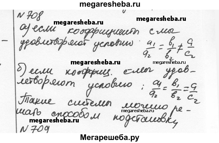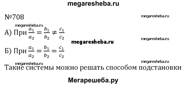 708. При каком условии система двух уравнений первой степени с двумя неизвестными, у которой пропорциональны коэффициенты при неизвестных: А) не имеет решений; Б) имеет бесконечно много решений? Можно ли решать такие системы способом подстановки?