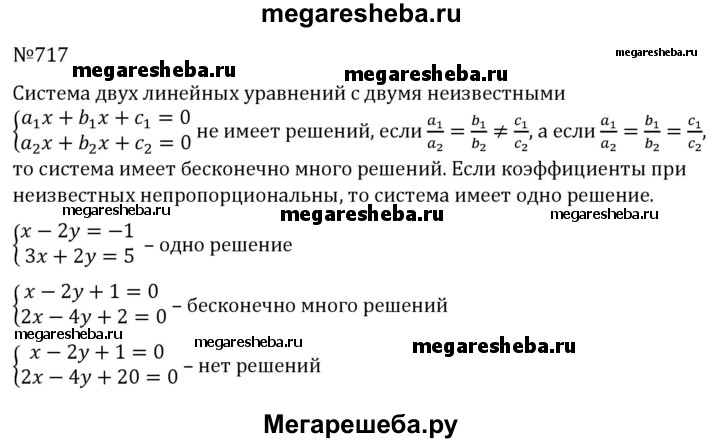 717. Может ли система двух линейных уравнений с двумя неизвестными не иметь решений; иметь одно решение; иметь бесконечно много решений? Приведите примеры.