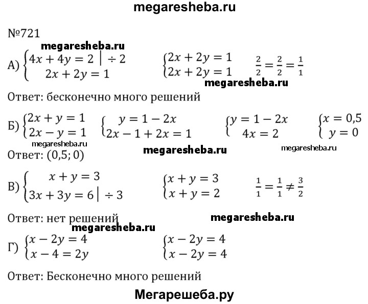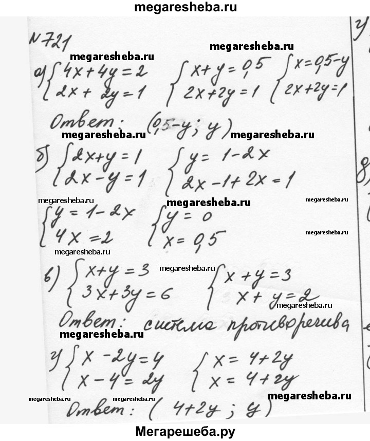 721 а) система 4x+4y=2, 2x+2y=1; б) система 2x+y=1, 2x-y=1; в) система x+y=3, 3x+3y=6; г) система x-2y=4, x-4=2y.