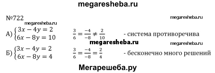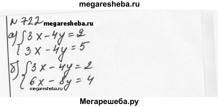 722. Составьте систему двух линейных уравнений, такую, чтобы одно из уравнений было 3x – 4y = 2 и она: а) была противоречива; б) имела бесконечно много решений.