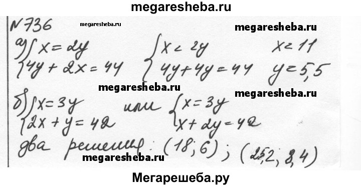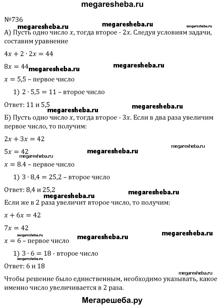 736. а) Одно число в два раза больше другого. Если меньшее из этих чисел увеличить в 4 раза, а большее увеличить в 2 раза, то их сумма будет равна 44. Найдите числа. б) Одно число в 3 раза меньше другого. Если одно из чисел увеличить в 2 раза, то сумма станет равной 42. Найдите числа. Сколько решений имеет задача? Как следует изменить формулировку задачи, чтобы решение было единственным?
