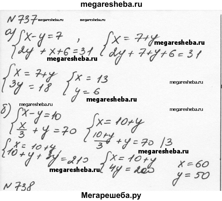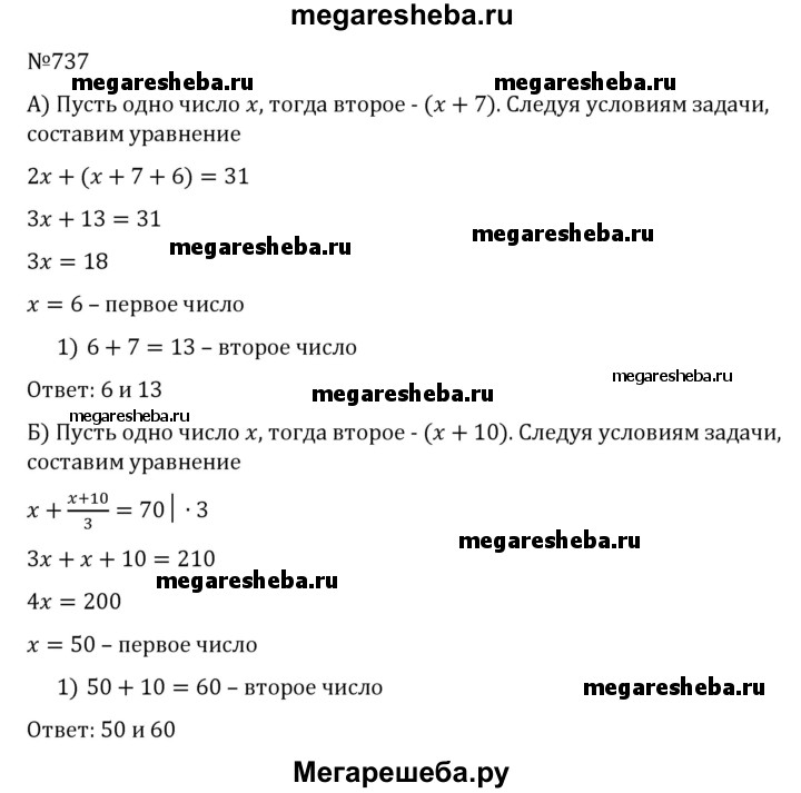 737. а) Одно из чисел на 7 больше другого. Если меньшее число увеличить в 2 раза, а большее – на 6, то их сумма станет равной 31. Найдите числа. б) Одно из чисел на 10 меньше другого. Если большее число уменьшить в 3 раза, то их сумма станет равной 70. Найдите числа.