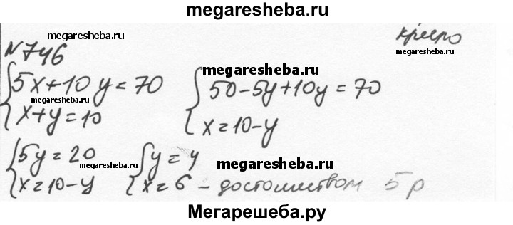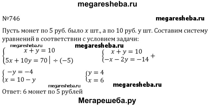 746. Рассчитываясь за покупку, мальчик получил сдачи 70 р. Монетами достоинством 5 р. И 10 р. Всего он получил 10 монет. Сколько монет достоинством 5 р. Он получил?