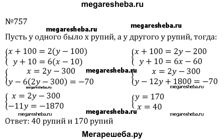 757. Задача Бхаскары (Индия, XII в.). Некто сказал другу: «Дай мне 100 рупий, и я буду вдвое богаче тебя». Друг ответил: «Да мне только 10, и я стану в 6 раз богаче тебя». Сколько было у каждого?