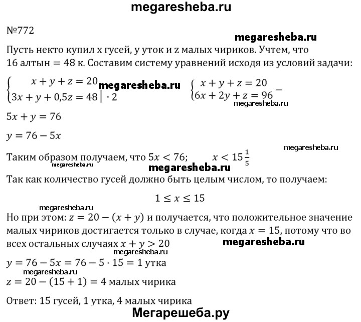 772. Старинная задача. Хозяин послал работника на базар купить 20 птиц: гусей, уток и малых чириков. Он дал работнику 16 алтын. Гусей велел покупать по 3 копейки за штуку, уток – по копейке, а малых чириков – по два на копейку. Сколько гусей, уток и чириков купил работник?