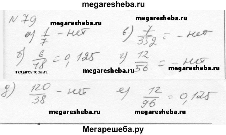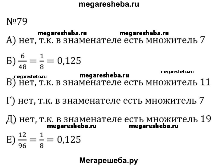 79. Возможно ли разложение данной дроби в конечную десятичную дробь: а) 1/7; б) 6/48; в) 7/352; г) 12/56; д) 120/38; е) 12/96?