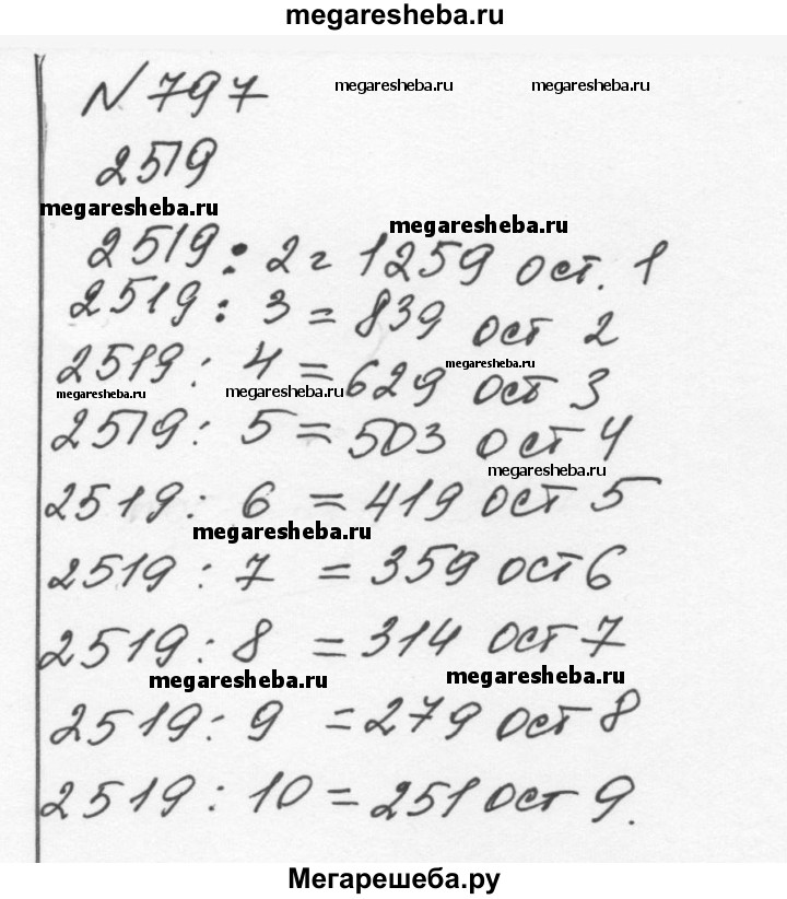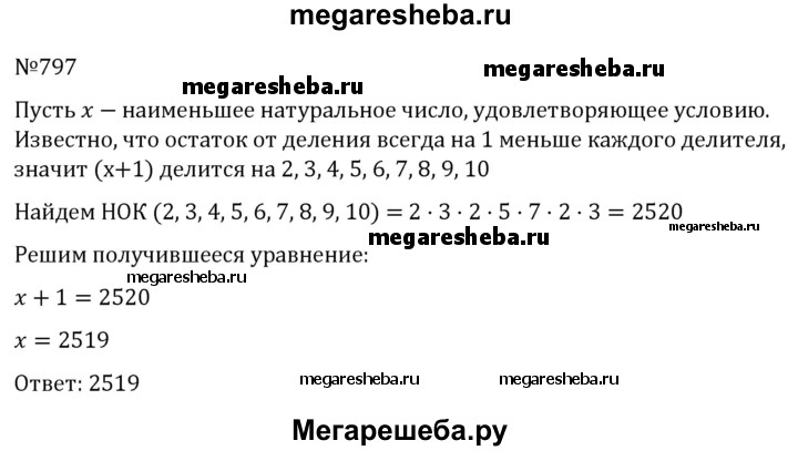 797. Найдите наименьшее натуральное число, дающее при делении на 2 остаток 1, на 3 остаток 2, на 4 остаток 3, на 5 остаток 4, на 6 остаток 5, на 7 остаток 6, на 8 остаток 7, на 9 остаток 8, на 10 остаток 9.