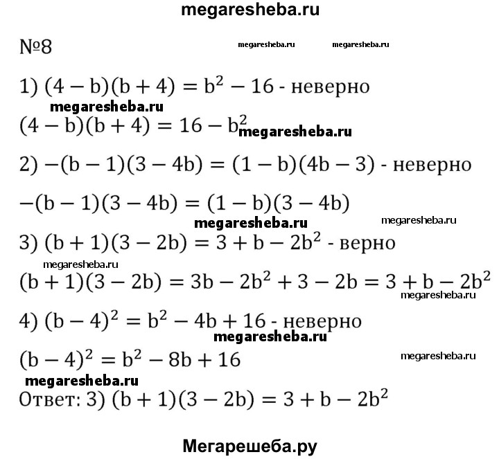 8. В каком случае преобразование выполнено верно? 1) (4 -b)(b + 4) = b^2 - 16 2) -(b - 1)(3 – 4b) = (1 - 6)(4b - 3) 3) (b + 1)(3 – 2b) = 3 + b – 2b^2 4) (b - 4)^2 = b2 – 4b + 16