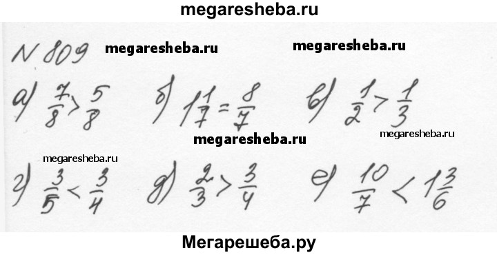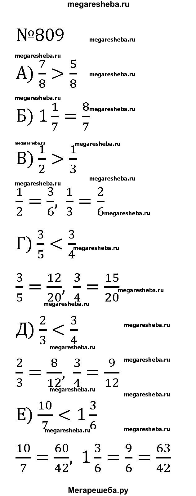 809 Сравните числа: а) 7/8 и 5/8; б) 1*1/7 и 8/7; в) 1/2 и 1/3; г) 3/5 и 3/4; д) 2/3 и 3/4; е) 10/7 и 1*3/6.