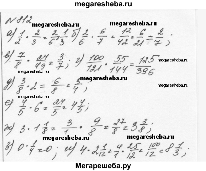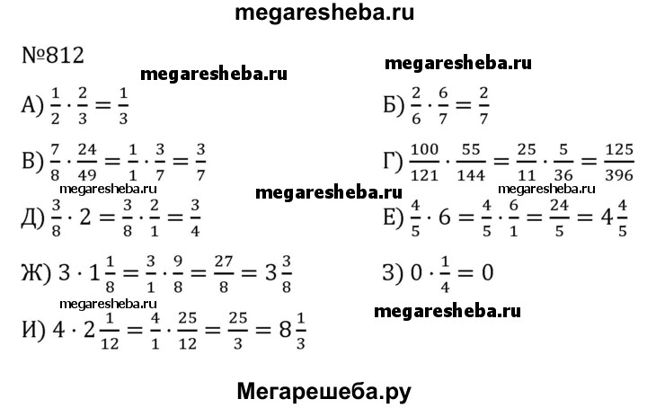 812 а) 1/2*2/3; б) 2/6*6/7; в) 7/8*24/49; г) 100/121*55/144; д) 3/8*2; е) 4/5*6; ж) 3* 1*1/8; з) 0*1/4; и) 4*2*1/12.