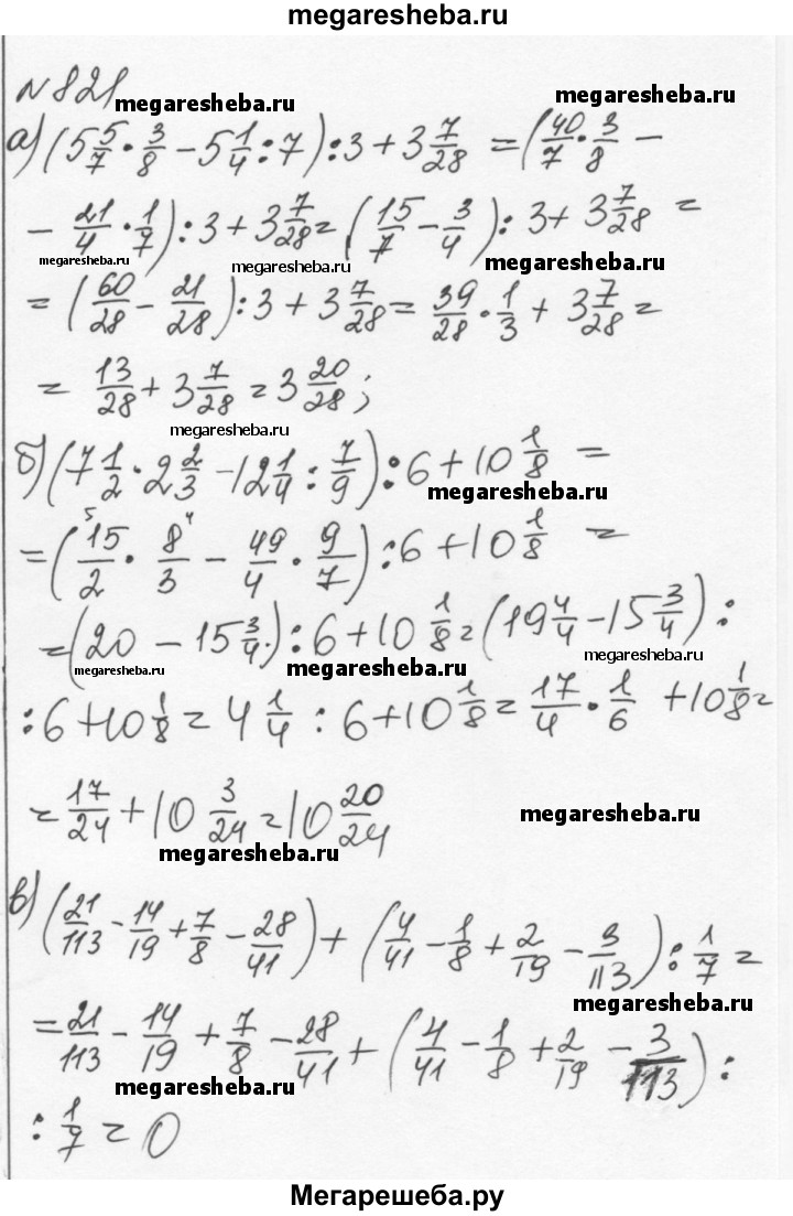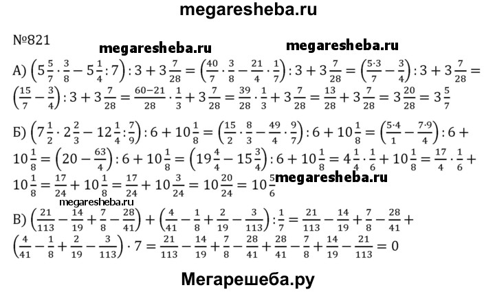 821 а) (5*5/7*3/8 - 5*1/4:7):3+3*7/28; б) (7*1/2*2/3 - 12*1/4:7/9):6+10*1/8; в) (21/113 - 14/19 + 7/8-28/41) + (4/41-1/8+2/19-3/113):1/7.
