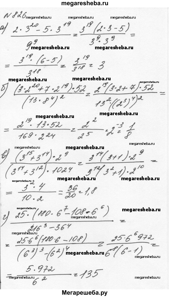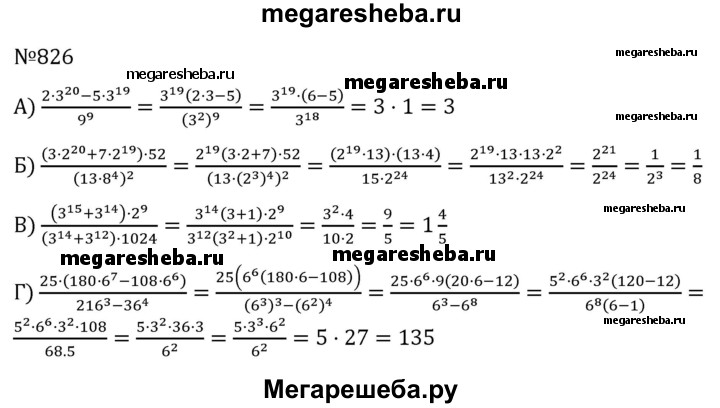 826. Вычислите: а) (2*3^20 - 5*^19)/9^9; б) (3*2^20 + 7*2^19)*52/(13*8^4)2; в) (3^15 + 3^14)*2^9/(3^14+3^12)*1024; г) 25*(180*6^7 - 108*6^6)/(216^3-36^4)2.