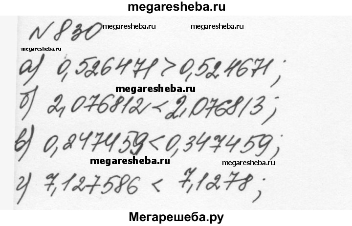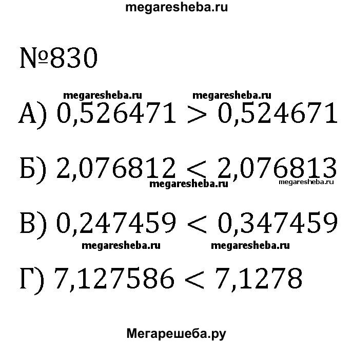 830. Сравните числа: а) 0,526471 и 0,524671; б) 2,076812 и 2,076813; в) 0,247459 и 0,347459; г) 7,127586 и 7,1278.