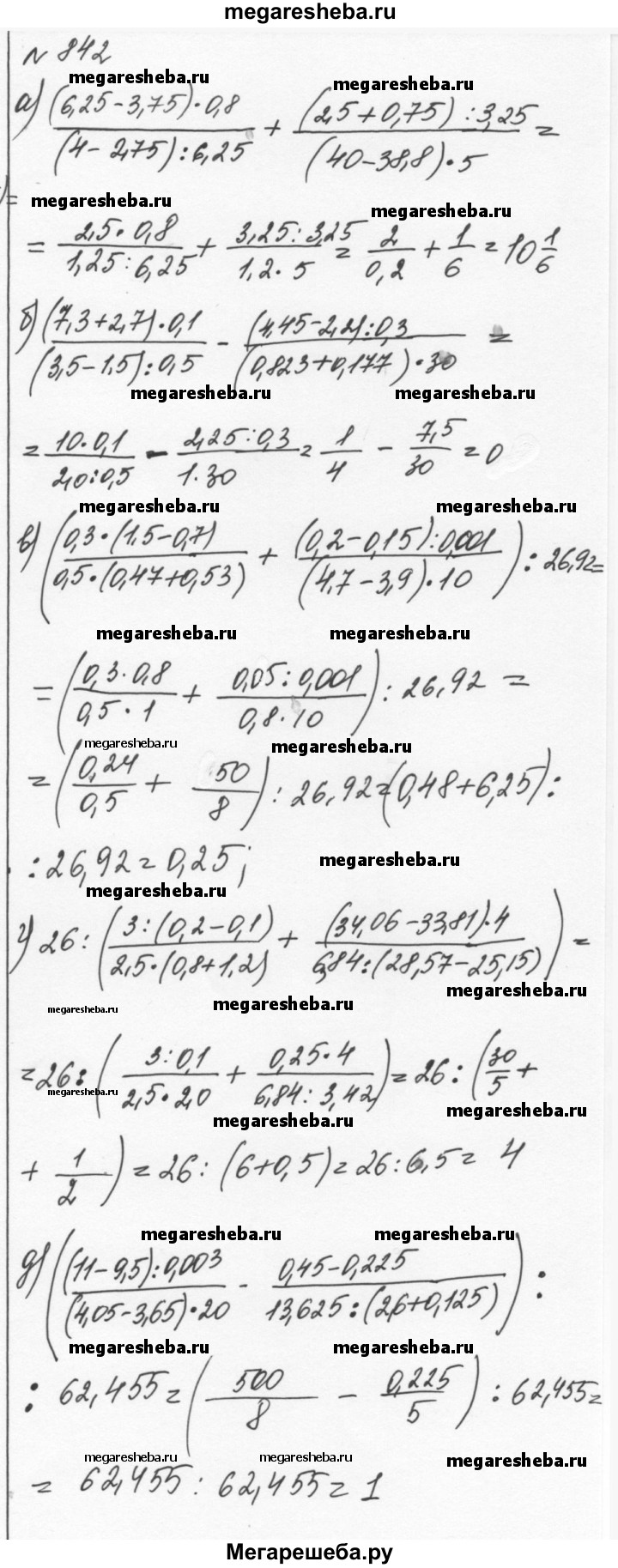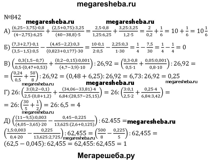 842. Из сборника задач для гимназий (XIX в.). Вычислите: а) ((6,25 - 3,75)*0,8)/((4-2,75):6,25) + ((2,5+0,75):3,25)/((40-38,8)*5); б) ((7,3 + 2,7)*0,1)/((3,5-1,5):0,5) - ((4,45-2,2):0,3)/((0,823+0,177)*30); в) (((0,3 * (1,5-0,7))/(0,5* (0,47+0,53)) + ((0,2-0,15):0,001)/((4,7-3,9)*10))); г) 26: (((3: (0,2 - 0,1))/(2,5*(0,8+1,2)) + ((34,06-33,81)*4)/(6,84*(28,57-25,15))); д) (((11 - 9,5):0,003)/((4,05-3,65)*20) - (0,45-0,225)/(13,625 : (2,6+0,125))) : 62,455.