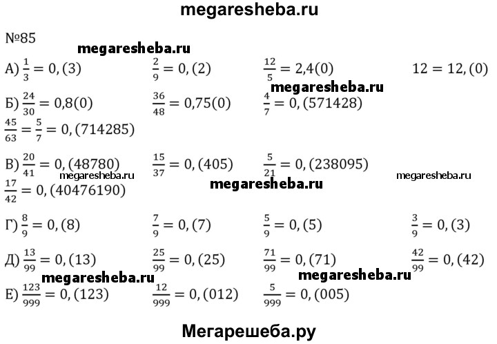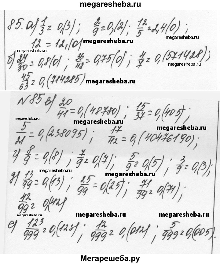 85 Как можно записать конечную десятичную дробь или натуральное число в виде бесконечной десятичной дроби? Приведите примеры. а) 1/3, 2/9, 12/5,12; б) 24/30,36/48,4/7,45/63; в) 20/41, 15/37,5/21,17/42; г) 8/9,7/9,5/9,3/9; д) 13/9,26/99,71/99,42/99; е) 123/999,12/999,5/999.