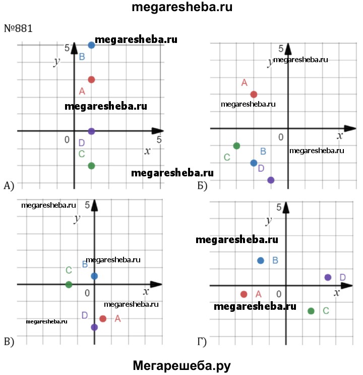 881. Постройте на координатной плоскости точки: а) А(1; 3), В(1; 5), С(1; -2), D( 1; 0); б) А(-2; 2), В(-2; -2), С(-3; -1), D(-1; -3); в) А (0,5; -2), В(0; 0,5), С(-1,5; 0), D(0; -2,5); г) А(-2,5; -0,5), В(-1,5; 1,5), С(1,5; -1,5), D(2,5; 0,5).
