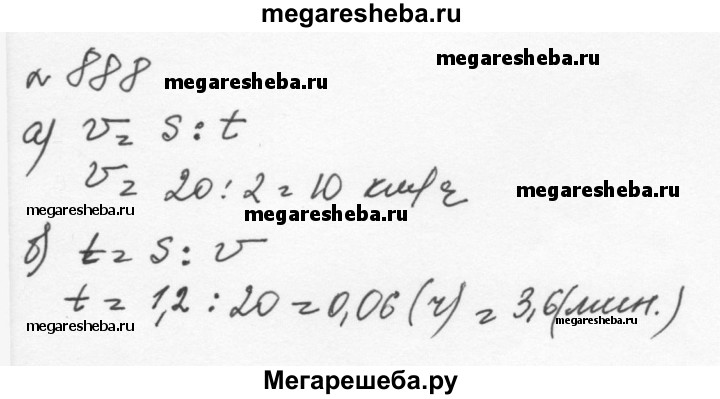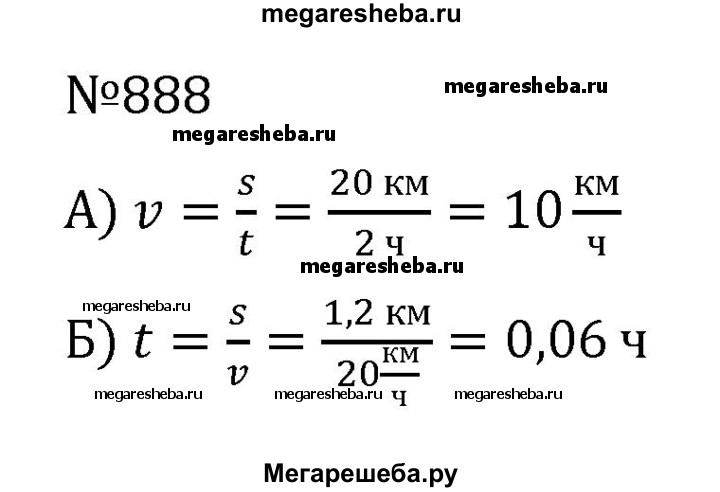 888. Длина пути s при равномерном прямолинейном движении вычисляется по формуле s = v • t, где v — скорость, а t — время движения. а) Выразите v через s и t. Вычислите v при s = 20 км, t = 2 ч. б) Выразите t через s и v. Вычислите t при s = 1200 м, v = 20 км/ч.