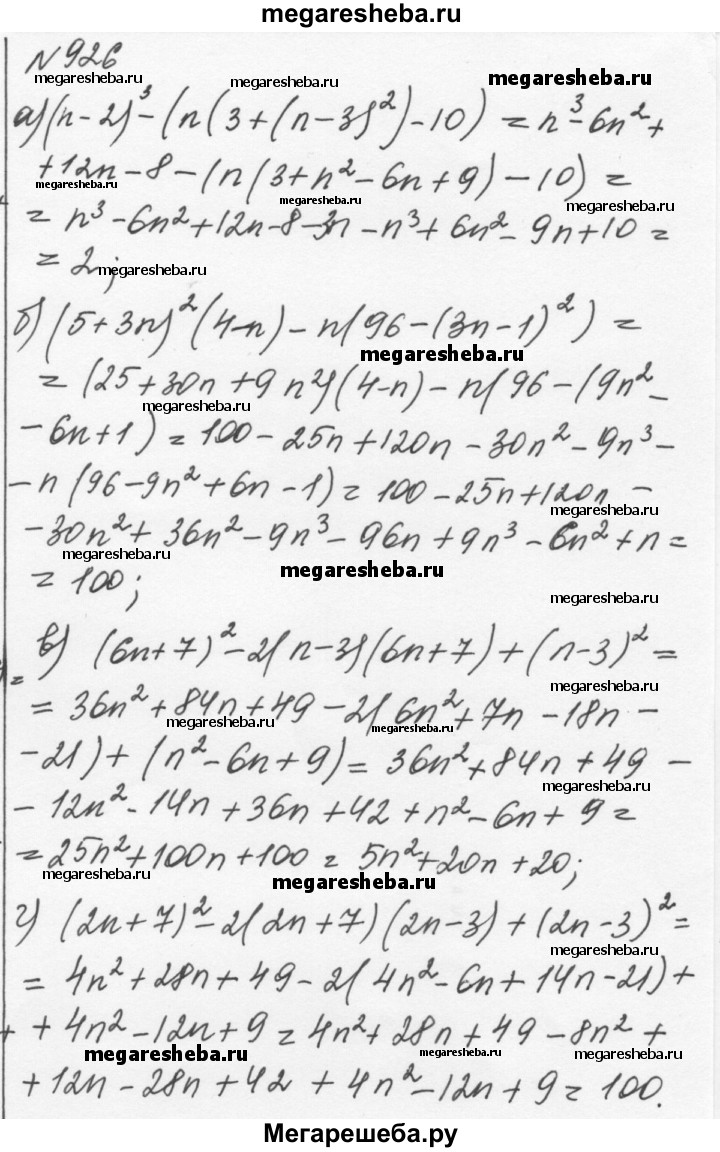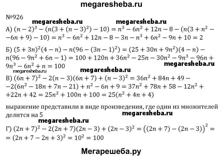 926. Докажите, что при любом целом n выражение: а) (n - 2)^3 - (n(3 + (n - З)^2) - 10) равно 2; б) (5 + Зn)^2(4 -n) - n (96 - (Зn - 1)^2) равно 100; в) (6n + 7)^2 - 2 (n - 3)(6n + 7) + (n - З)^2 кратно 5; г) (2n + 7)^2 - 2 (2n + 7) (2n - 3) + (2n - З)^2 кратно 10.