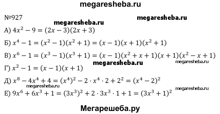 Разложите на множители (927—931): 927 а) 4x2-9; б) x4-1; в) x6-1; г) x2-1; д) x8-4x4+4; е) 9x6+6x3+1.