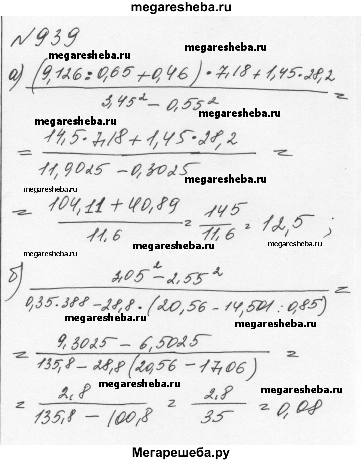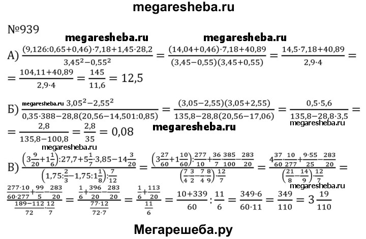 939 а) ((9,126:0,65 + 0,46)*7.18 + 1,45*28,2)/(3,45^2 - 0,55^2); б) (3,05^2 - 2,55^2)/(0,35*388 - 28,8*(20,56-14,501:0,85)); в) ((3*9/20+1*1/6):27,7+5*1/7 * 3,85 - 14*3/20)/((1,75:2/3-1,75:1*1/8):7/12).